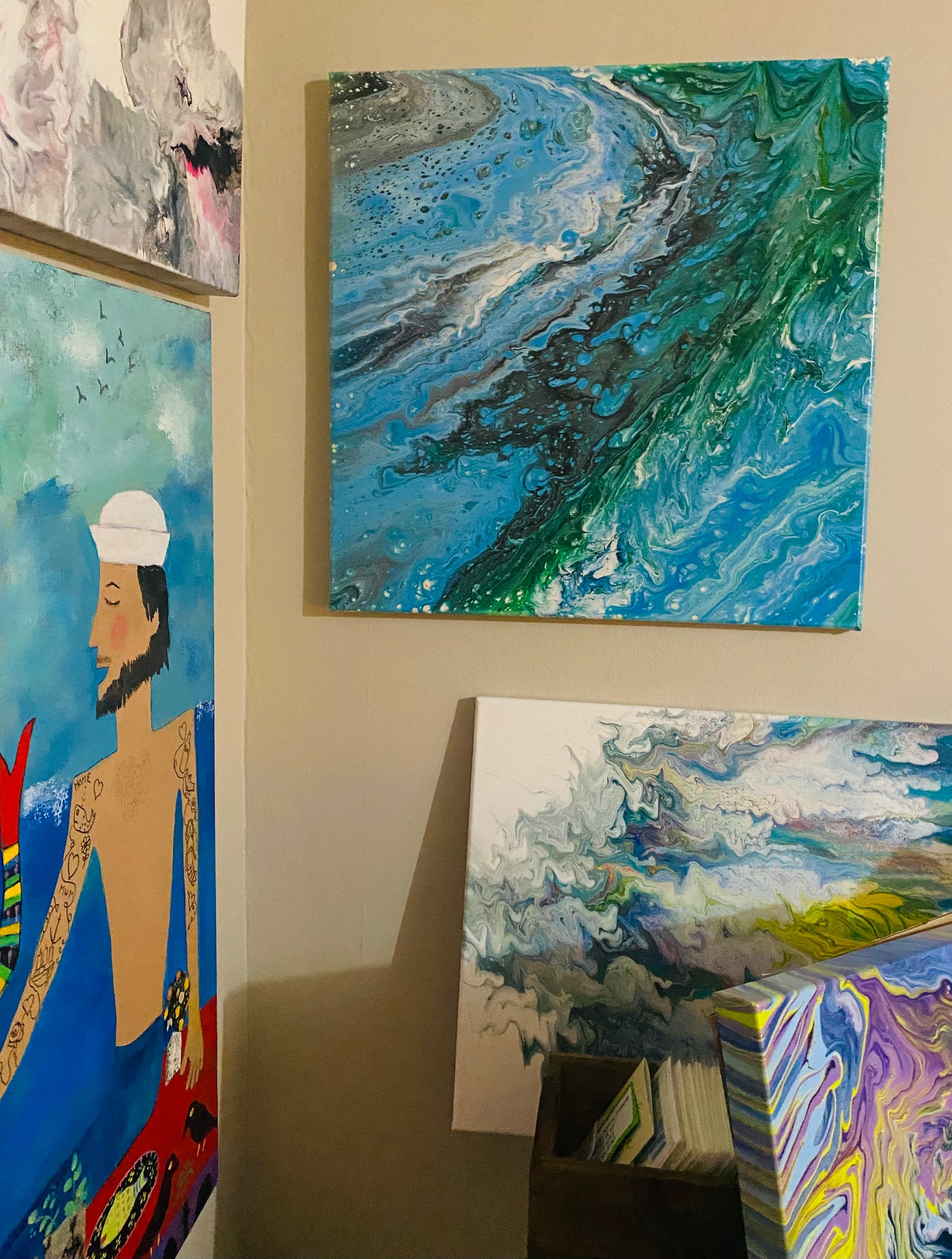 This acrylic pour painting, titled “Flying High 2”is on a canvas measuring 20"x 20”. A combination of blue and green shades of paint were tilted on the canvas to get this sky high view of the beach or water. I painted another painting this day which has similar colors. The two complement each other when hung together, or look great on their own.